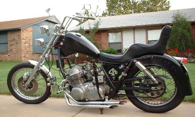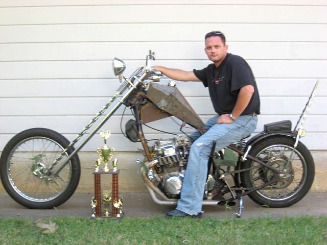 In Memory of RideLord. GOTF Member 8/25/73 - 9/21/2008 It's a '76 modified stock frame, about 4" in the down tubes, 1" in the backbone, and the seat rails dropped down. It's running a Sporty tank and forwards, a custom built oil tank and a French Army first aid kit to house the electrics. My favorite piece, though, is the US Army World War II bayonet that my grandfather carried mounted as the gear shift. Jason passed away on September 21st, 2008. Surviving him are his two