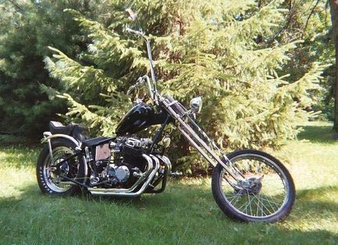 She has the lines that have always said 'Chopper' to me. To me, a chopper has always been an old skool ride, long front end, tall ass bars and a big ass engine crammed under the seat. (And those four exhaust pipes and carbs on the back help out alot too.) So when the time came that I needed a new ride, she became the one. I dove into the untamed world of choppers when I drove 24 hours to pick her up. And I might not have made that leap had I not found HondaChopper.com. Here were people still out there wrenching on their rides. I realized I would not be alone. What I did not realize was I had no idea what a chopper really was. Considering where this letter is going, I don't think I need to elaborate on that last comment. So I'll wrap this up by saying: No, I did not build her. I started with alot more than some. But I have spent many nights into the early morn with her. I have spent many sunny days in the garage watching the brand new Sportsers ride by the house whilst I scream, swear, smoke a cigarette and scratch my head in bewilderment and convince myself I could make it work this time. I have been on the side of the rode with her; late at night under the flickering neon lights of a long closed bar. We have scraped pipes on winding turns, up hills, between the maple trees of back-woods roads. We have cruised down the strip by the Harley's and Customs while everyone raises their arms pretending to ride, apes extended over our heads. She is mine, and she is far from finished. But at least I know where to go when I need a hand. Later, D.
