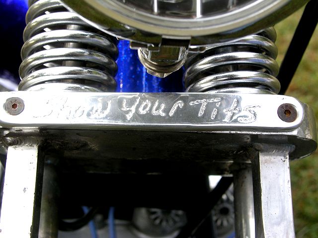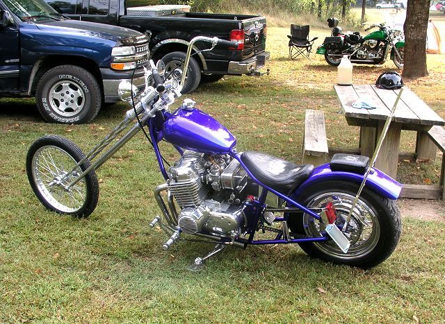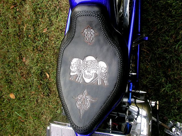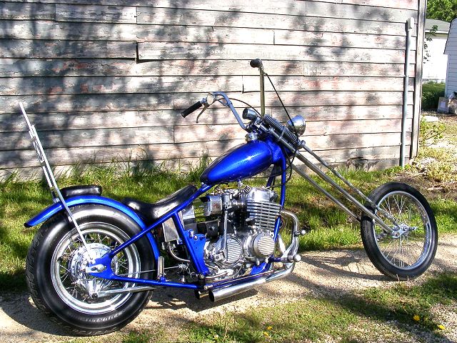 I'm just an average guy with a love for motorcycles. I'm not a Pro or specialist by no means. The bike was running when I bought it. I had the seat re-covered and took off all the pin stripping the next day. I made it ride-able for the season. The next winter I started stripping it down part by part. I took the frame down to bare metal and did the body work that needed done. I made a new seat pan and pillion pad. I sent those off to Amidemon for him to do his magic with leather. Next was paint, laid silver base followed by chrome metal flake and then custom blue candy. I smoothed the valve cover and engraved the cam chain cover. I sent the sissy bar, chain guard, and oil tank off to be spray chromed. Then I did my final assembly. I bought like new carbs off of HounDog because the originals weren't up to par. Kevinr13 Builder/Owner: Kevinr13