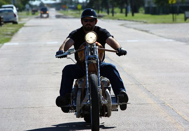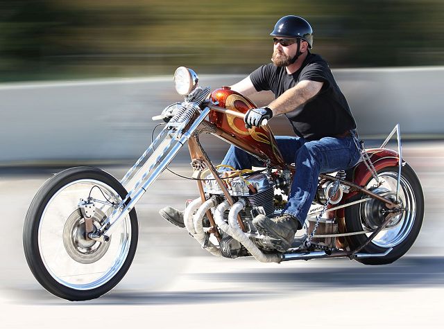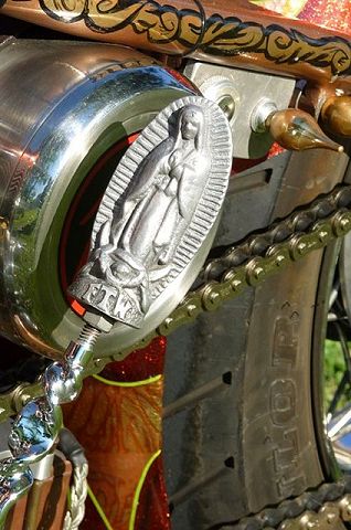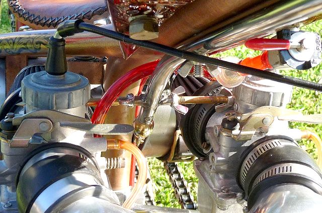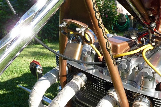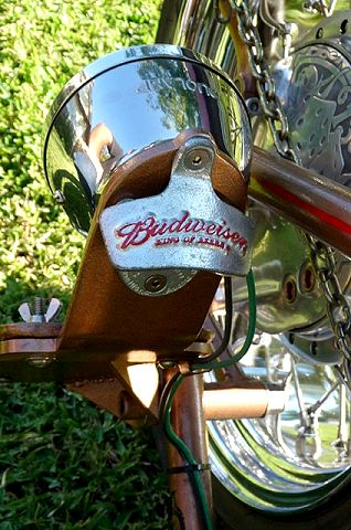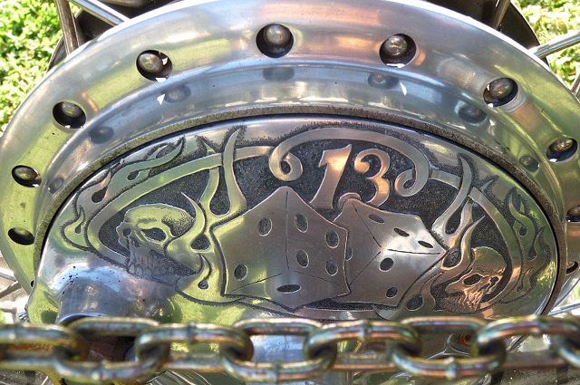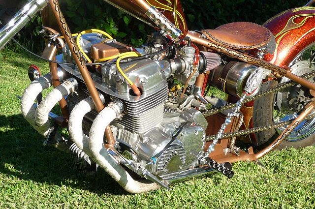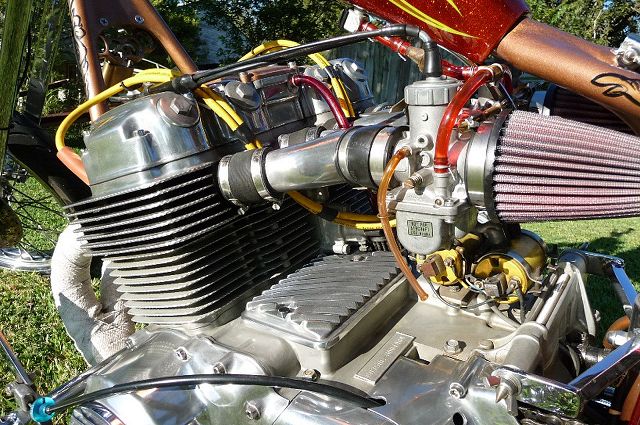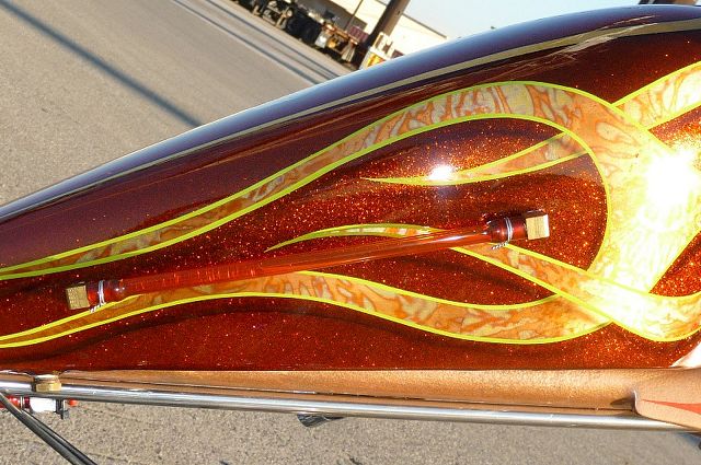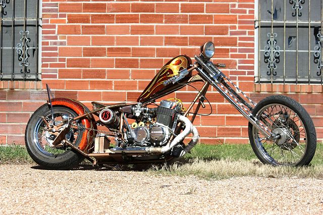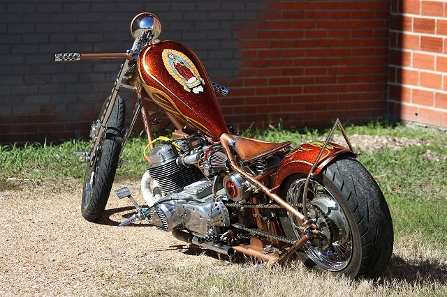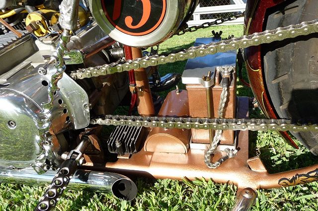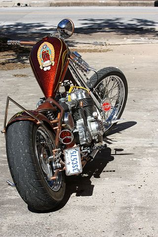 Many of you will remember the many transformations of this Honda chopper being built by GOTF Emeritus member Dirty Rice. Dirty did the final redo of the bike a couple of years ago and our own Dr Skull66 (Mark Short) had to have it and bought it immediately. Dirty had done the dirty work, the basic design and building, fabrication and assembly, the outrageous engraving, and the hand painted artwork that offsets the copper and brown flake paint. Saying that Dirty is a gifted artist would be putting in lightly. This bike is beautiful. Once Mark had bought the bike he immediately began to finish it and detail it extensively. Dirty had done his part well, but Mark is a perfectionist and re-did some of the things his way. When this bike first came to life Dirty used a Santee swing arm frame and grafted on an HD big twin hardtail. Throughout the build Dirty hand crafted many items. The stainless sissy bar and the jockey shift, the oil tank out of two kitchen canisters from Bed Bath and Beyond, and the handlebars started life as a jack handle from a hydraulic floor jack. He added many, many more innovative accents too numerous to mention. Dirty used an old 10 over D&D springer with a 70s Sporty front wheel and a Sifton caliper up front. The motor is a standard K model with an 836 kit in it fired by a DynaS ignition and Accel coils. The Cycle Exchange carbs and filters feed the gas from a West Coast Choppers Villian tank and Dirty picked up a WCC rear fender to mount at the same time. After Mark got the bike he found a guy named Gypsy to Diamond Cut the edges of the fins on the cylinder and head to finish it off. Dirty went to LRT at Lowriders By Summers to build him a 16x6 rear wheel with a 180 Avon tire to fill the WCC fender and it does just that. Mark has spent the last couple years detailing the bike, redoing things and making mods of his own design. You know, all that piddly stuff you see when you get up close and personal. After immediately adding springs to the seat Mark fabbed the license bracket from a Model A tailight and an old bottle opener, the brass knuckle holder for the lock, and built a stainless and brass bracket to keep the carbs solid and secure. He rewired the complete bike the way he wanted it to be. using more fuses all around. Mark added wing nuts and stainless and brass hardware throughout the bike. Mark has finished something that Dirty Rice started years ago, and it's finally DONE (for now). Great job Dirty, and kudos go especially to Mark for getting this all