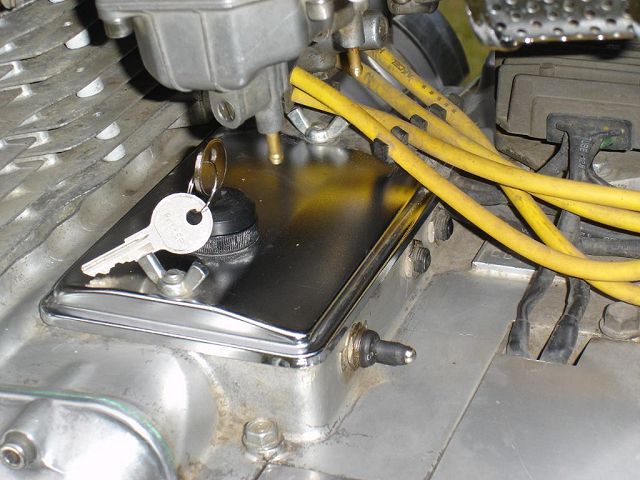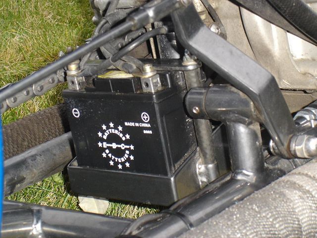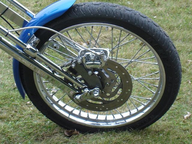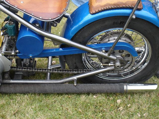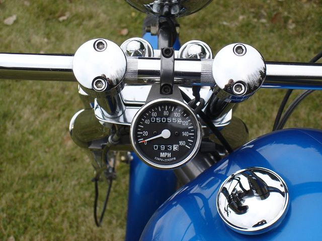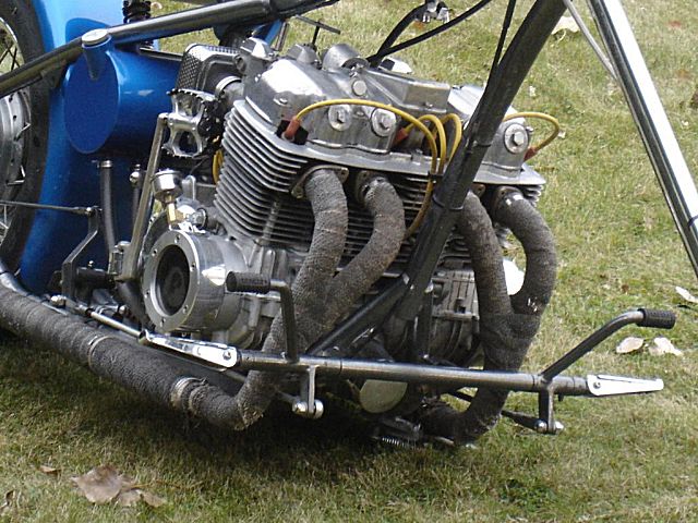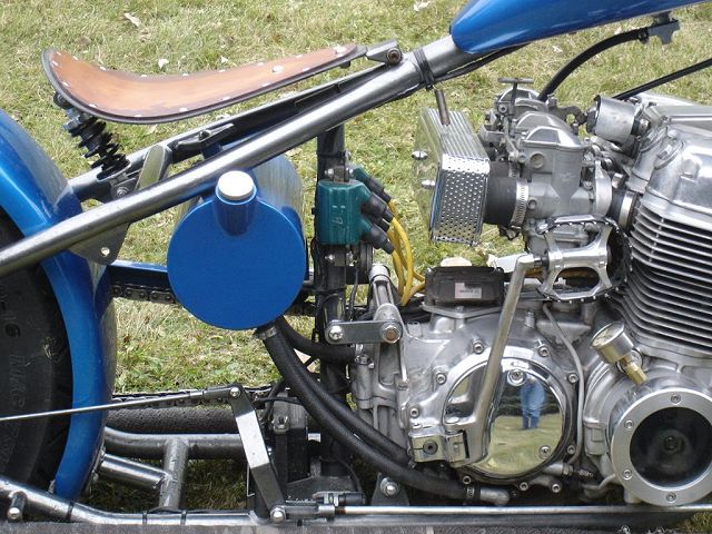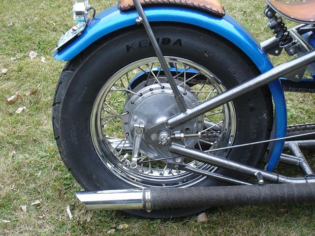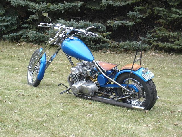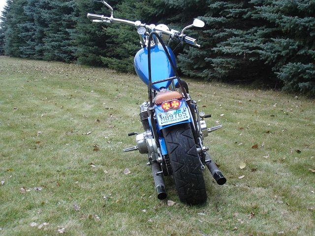 This bike started out for me as kind of a goldwing wannabe. When I bought it, it had a vetter windjammer fairing, complete with stereo and poor mans surround sound, a big nasty trailer hitch, and a luggage rack/backrest. First thing I did was to pull the hitch off, clean up the carbs some, and get it running. Since this was my first bike it became quite a learning experience. I got it running pretty good and rode it like that for a while. Then I found HC.com and shortly after it hit me. I started making changes. I added forward controls, changed the exhaust out, removed the airbox for some v-stacks, removed the fairing and other extras. I then added a pair of 8" over forks, extended the down tubes, added struts to drop the rear, and started thinking of it as a ride-able mock-up. After riding it this way and making numerous other changes I decided I knew what I was looking for. I found the front end, front wheel, and rear rim on ebay. With a phone call to Baz, and a set of SS spokes from TAS classic motorsports, I laced the rear wheel to a stock Honda hub, and mounted the 160-80-16 tire. I contacted Tigman about a frame, got him some measurements from my parts, and ordered up a frame. The gas tank, and fenders are from ebay. The oil tank, chain guard, battery tray, sissy bar, exhaust, and forward controls are home-built, including, the headlight, mini-speedometer, seat, exhaust, and coil mounts. I also added passenger seat and passenger peg mounts just in case the kids wanted a ride. All of this, including final assembly was done in my apartment garage with a minimal amount of hand tools, hand grinder, hacksaw, small drill press, and a borrowed 110v mig welder. Once the bike was mocked up and tore down, the frame and accessories went to Neal's Industrial Painting in West Fargo ND for the "Black Chrome" powder coating. Being bikers themselves the folks at Neal's got excited and rushed my parts through, and what was suppose to be a weeks wait , ended up being one day! So, a big THANKS! goes to Neal's! The tanks, fenders, and chain guard went to my wifes uncle Randy who did the necessary body work and applied the Hot Hues "Blue Mood" paint. The motor remains stock for a '78, I cleaned it up a little and changed out some gaskets to stop the oil from getting out. The carbs are still the '78s also, with a little "Houndog" magic they work quite well for me. When it came to wire the bike, I used Jaysco's redrawn simplified wiring diagram, which includes, headlight, taillight, Dyna ignition, 2 marine breakers, and marine ignition switch. To keep it simple I kept the wiring all exposed, but wrapped in heat shrink tubing to make future repairs easier. And because I am not a big fan of the electrical boxes, I tucked my switches and breakers into the empty starter cavity, since it is kick only anyway. With a trick I learned from our very own LRT, I ran my plug wires through the holes in the cylinders from the coils to the spark plugs. I always liked the look myself! My seat is a solo seat with a bicycle shock to soften the ride, covered with a piece of leather which is riveted on. The passenger seat is a steel pan I glued a piece of foam onto and covered in leather. I finished the bike off with a couple nice pieces from a couple fellow members, a BMX style kicker pedal from Naguethey, and a very cool points cover from Lynn at Back Porch Customs. I bought many of the parts from either ebay, members from hondachopper.com, or suppliers like LRT, and TAS. I had much help along the way from members like Houndog750, LRT, Naguethey, Roadkill Savior, Onceanite and others, either by email, PM, or even some phone calls. I also have to thank all the people who have answered some of my many questions along the way, without that I wouldn't have learned what I have about these bikes! Drew Miller (dtmmil at