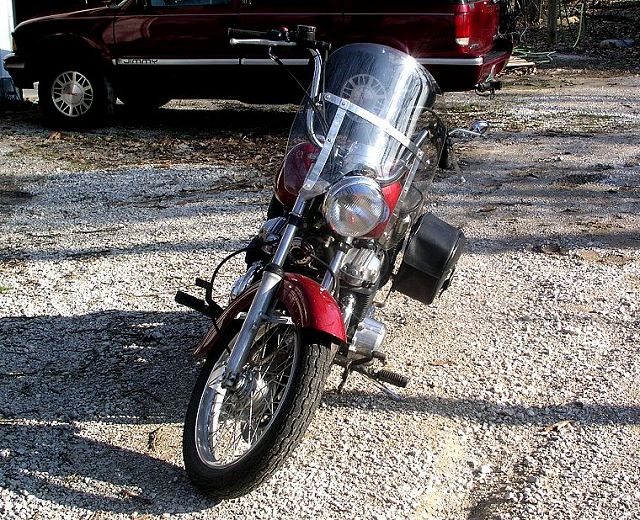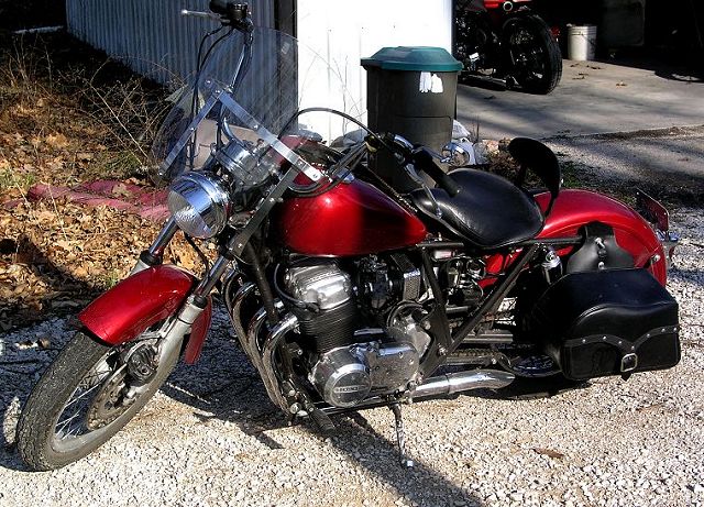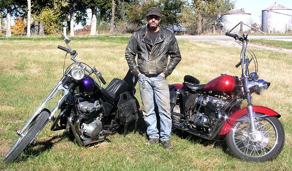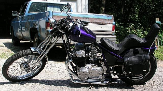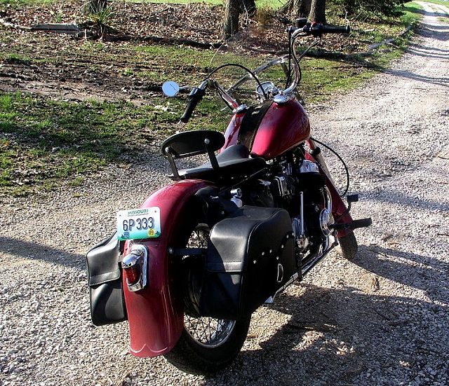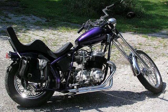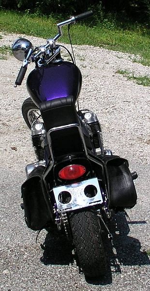 "Red" After close to 25 years in the saddle of a hardtail my kidneys and back were telling me time was catching up and I was no longer a spring chicken. I picked up a failed 75 cafe project and after over a year of stops and starts was finished in August 2007. I have always loved the looks of the classics and was shooting for the looks of the older Shovels/Pans. The swingarm was replaced with a 78 giving me another inch length from pivot and short shocks lowered the bike even more. The frame had to be widened to accept the 7"+ rear fender and have enough room for braces and such. The forwards were made from strap steel and leftover frame with modified stock rubber pegs. Backrest/lumbar support is sheet metal, strap steel, 60's Ford door trim, and cannibalized $20 Walmart pseudo leather purse. One comfy road bike for longer trips, and my kidneys/back have been thanking me since. Builder/Owner - Houndog750