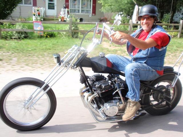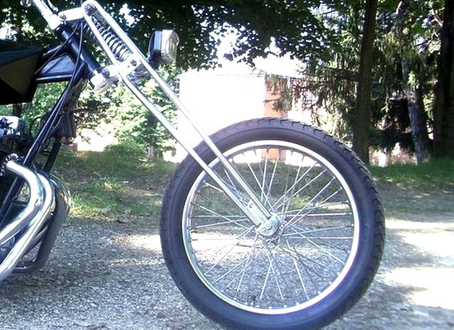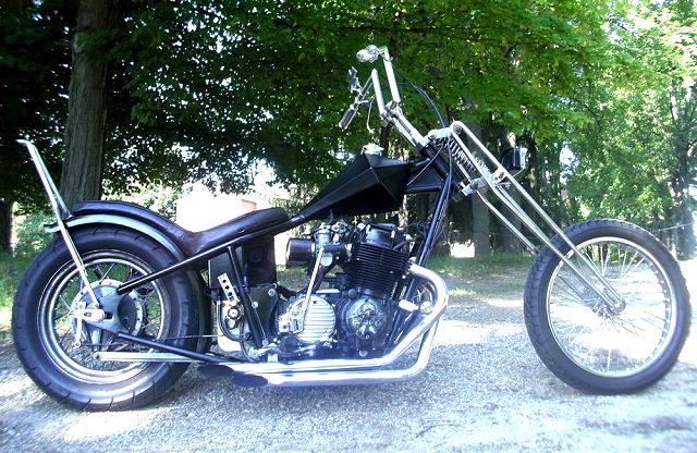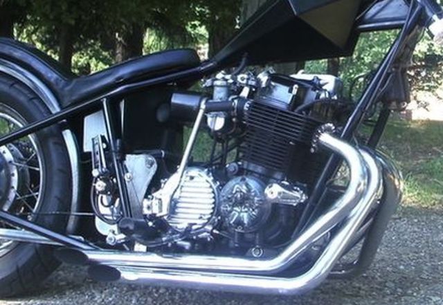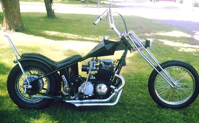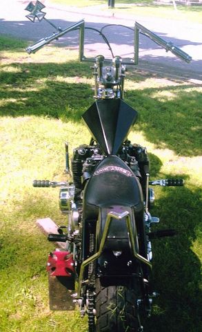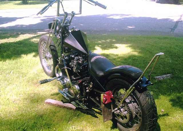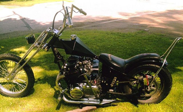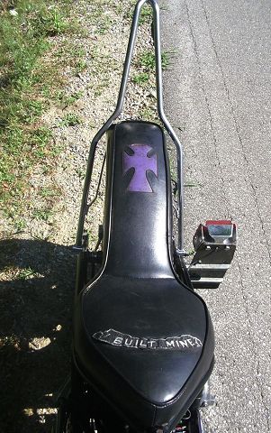 This is a bike built a while back by Feederpig, a member here at HC.com, but Mark has sold it this past summer. Mark started with an Amen rigid frame and oil tank with a P&P girder. He used a 19" spool front wheel with a 16" rim laced to the stock rear hub. 6" risers with 8" z-bars sit about the old school prism tank. Some of the smaller details are the sword shift lever, the hand made cover over the pods and on down to the Finch Boobie point cover. A small rectangle headlight and the iron cross taillight brighten up things at night and the custom seat follows that iron cross theme under a 12" pointed sissy bar. All of this wrapped in a heavy coating of semi gloss black paint. All in all, a nice tight package of old school goodness that Mark rode everywhere rain or shine. Nice job Mark. . |