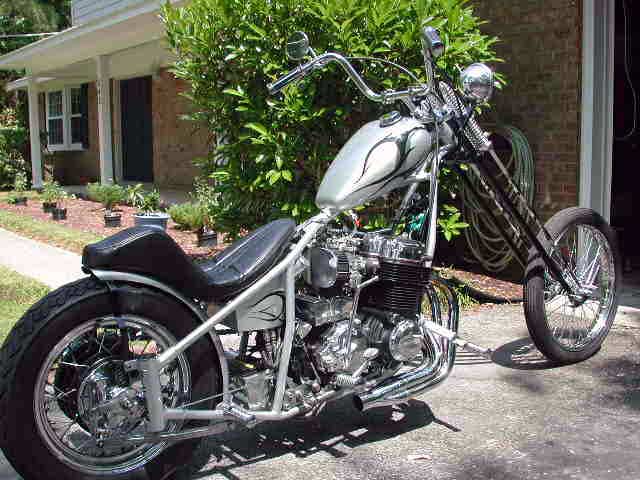 Here's my '74 Santee chopper. (it WAS red, with a diamond gas tank, and king and queen seat). I've made a FEW changes. The bike now has a 836 kit, mega cams 125-65 cam, Vance & Hines header for a CB 900, Dyna ignition and more hours labor than I care to admit. But it has been a fun project and I'm very happy with the results. Just came home from bike week in Myrtle Beach. Blast! I got a lot of compliments from the older crowd of Harley riders. Thanks,
