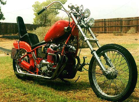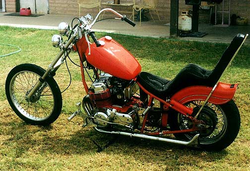 I've enjoyed your site and really appreciated the information. I hadn't ridden in 20 yrs and found out Arlen Ness became god while I was gone and I didn't really care for it. I can't afford the "hundred dollar" brand but remembered the CB 750 chops some of my old bro's rode. I found this bike and made some mods to make it ride able and perk up the performance a little and proceeded to go riding. I had also ran an old Yammy 750 triple and a Gold Wing, didn't care for them alot. This bike is called the "Pumpkin" for obvious reasons. I expect to change this one around when i finish a CB swingarm project I'm working on now. Ciao,