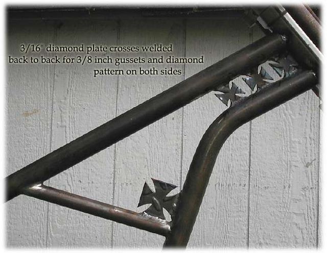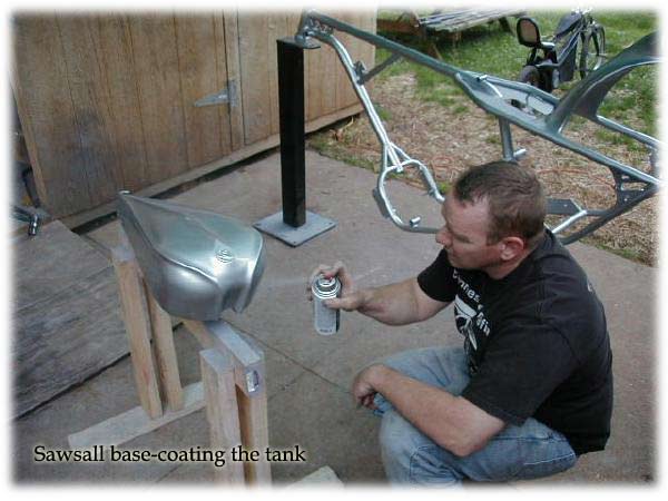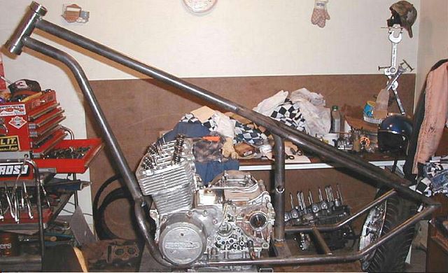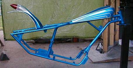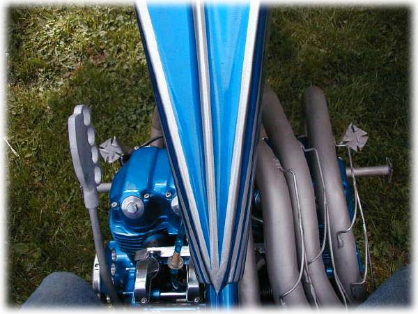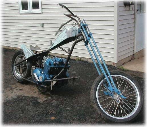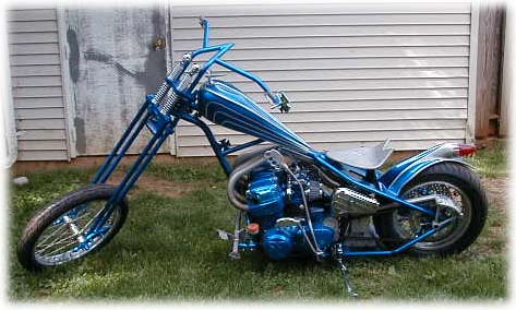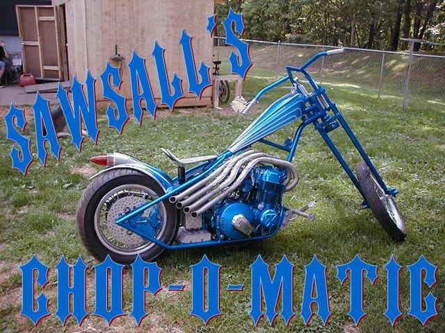 Over the last two years, you may have seen or heard about Mark "Sawsall" Riehle "Chop-O-Matic" project. Finished in Summer 2004, the "Chop-O-Matic" is an achievement. Built by one man, it's got his stink all over it. He fabricated almost every component on this bike-- the frame, the bars, the tank, the forward controls, those amazing pipes, you name it! The "Chop-O-Matic" is ballsy mix of futuristic design and jaw-dropping old-skool craftsmanship. I wanted to do something special to recognize Hondachopper.com's 100th Gallery page, and there's no better way I can think of than to dedicate it to G.O.T.F. member Mark "Sawsall" Riehle, who embodies the best of what this site is all about-- enthusiasm, knowledge, craftsmanship, brotherhood, dedication, and service to the Hondachopper community. Ride on brothers!