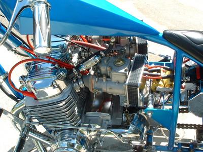 With the same dedication that a trained jewler would shape a raw piece of carbon, G.O.T.F. member Chopperholic created a masterpiece of steel and aluminum. This rolling show piece is appropriatley named "The Diamond Bike". The attention to detail and never sacrifice on quality attitude has made a chopper worth drooling over. The diamond bike sports a ground hugging stance that means buisness. With a chromed engine breathing through those huge carbs this bike screams FAST!! The Diamond Bike sports, VERY rare Weber Carburetors, Henry Abe tappet Covers, Kool Fins, Accell Coils, Mac Drag Pipes, Forward Controls, and too many other parts to list. Anyone who knows