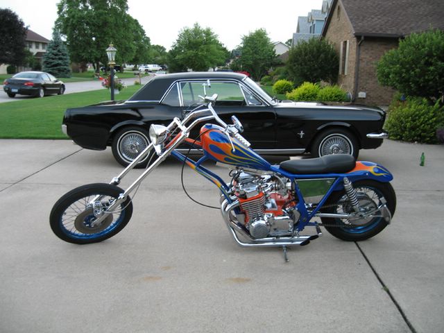 This killer ride belongs to the quietest, most docile, well mannered person I know...... OH,, Who the hell am I kidding. If you've ever met Mad Daego you already know that he is just the oposite of that. I think that is why he is so liked. He's like the first case of the crabs you ever got. No matter how hard you try to get rid of them they just won't go away. So you have a choice, bitch about them or nick name them and call them pets. We'll call this crotch critter,,, Daego. But Lets get to why we're all here... THE BIKE!!!! If your one of the Old Timers at HondaChopper.com you will no doubt remember the now infamous story of Daego's bike bursting into flames and burning up. This is the same bike. Much like the Mythical Phoenix it was brought back from the ashes. But this time with the help of a wizard. Daego pushed his chared bike down the road to LowRiders by Summers. Daego proceded to cut a deal in a way that only he could. He would get to apprentice at Lowriders By Summers and help Tom, . LRT on the other hand would help the greasy Italian build his bike. The Wizard had an Apprentice. Daego put in Hours of Blood, Sweat and Grease Into this project and Tom stepped in and helped when he needed it. The bike remained a Swingarm because Tom thought the rigid rear end would have left too much "open air". The Frame was completed by one of the many shops in Lowriders By Summers network of friends. The Custom Oil tank is a tank that Daego latched onto. It was a tank that Tom USE to produce for the 750's and was the last one that he had. The left side has the ignition switch built in and the right side has the fuse. Daego's effort paid off, After putting MANY hours into cutting grinding Molding the body and priming the bike LRT worked his magic on the paint and this is what the final product looks like. Simply put.... KOOL!!!! Details: