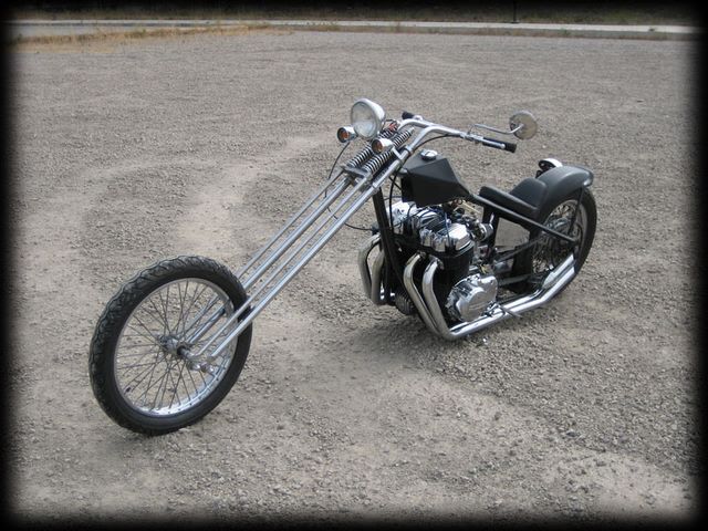Let me first point out I am NOT a bike builder, but re-builder. Although I totally stripped every last nut and bolt off this bike and re-assembled it with slight changes, I really didn't do any serious fabricating. The bike when I got it was a basket case, sat for 15-20 years not running, pieces went missing and age took it's toll. I took it apart, stripped the paint off the frame and replaced it with 5 coats of bomb can paint, cut the king/queen seat in half and had the local interior shop pad and cover it. Most of the electrical was either missing or shot so I rewired it, got new coils and ignition and a solid state regulator/rectifier unit. After inspecting the motor as good as I could without taking it apart I deemed it run-able, after 10 straight minutes of kicking (starter doesn't engage) it fired up. Most of the braces/brackets are from the hardware store, all the chrome is pitted from the rust (some still has rust on it) even after countless hours with steel wool and polishing compound. I guess you could call my chop one of those 10-Footers (looks good from 10 feet away), but that's fine with me. It took six months and $2500 (including purchase of the bike) to finish. Thanks,