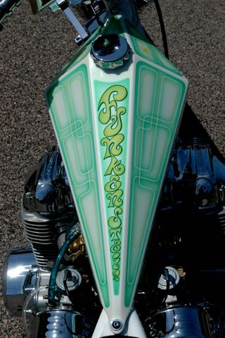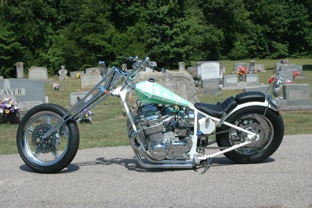 Here is a killer Bike, Clean Lines, Clean Wiring, Clean Paint..... VERY NICE.... OH,, and as always finding a HOT LOOKIN CHICK to straddle (or lay on) your bike immediatly catches my eye. This bike was built by Duane Ballard, the master leather worker that has created seats for many pro builds and hondachopper guys alike. If you need a custom leather seat I would recommend him hands down. SO when your done feasting your eyes on the hot redheaded beauty on the chop,,, take a long look at the bike and read the stats in Duane's own words, or the list below. My frame is a C&G that I bought from someone in Ca. I hade Marc Rowe at Rowe Machine replace the neck with an hourglass style HD neck. The oil tank is something a buddy had in his garage. The Ness tank is an NOS one that I found on ebay and won for 100 bucks. It was PERFECT. My motor was built by Ken at Cycle Exchange. 836 with cams, his carbs, and lots of shiny stuff. My rear wheel is from custom chrome and is 16", the front is a hd aftermarket wheel. It's a 19". I have a 11" disk in the rear with mounts by Fab Kevin. The front is a 10.5 with a six piston caliper. The front end was built by Paul Durfee especially for this bike. It handles incredible. The bars were built by Cole Foster as a favor after not being able to find any I liked. The hand controls are Arlen Ness Retro. Robert Pradke painted the tank and fender. The frame is appliance white powdercoat. All the ignition items were bought from LRT. They also came with alot of help over the phone during final assembly. Thanks! The pipes are Mac Drags. Kickstand is Matt Hotch. A buddy and I made the sissy bar from a fab kevin strut kit. I've driven it about 4000 miles this summer with very little probs. It's all been a few wiring things that were easy fixes. Some hack made the seat. I think that's it. Builder, Owner -