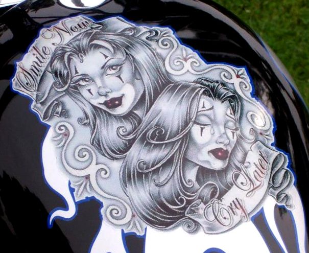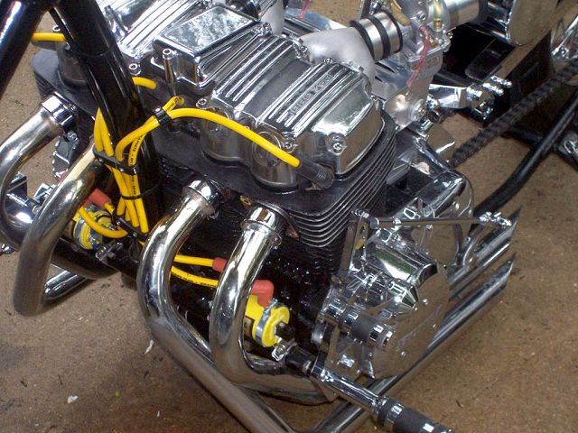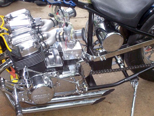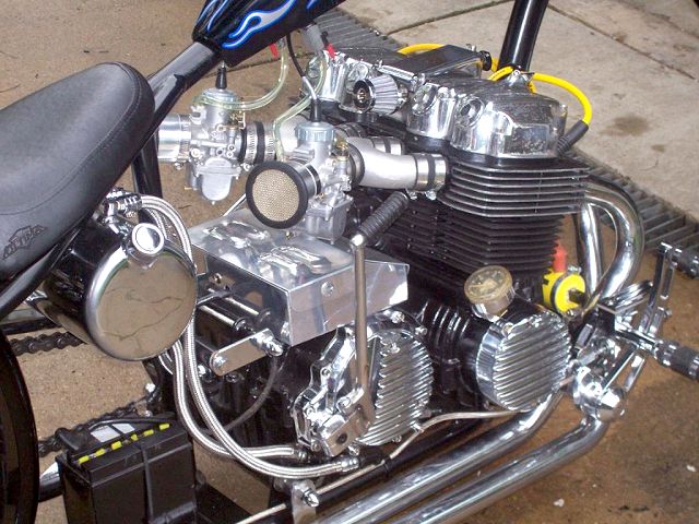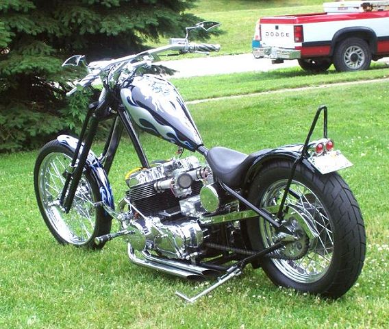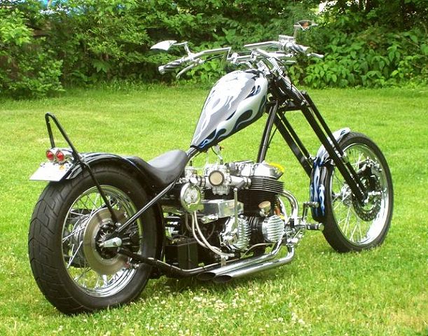 Owner/ Builder: Bill Mapp (ONCEANITE on hondachopper.com) . Bill has been around hondachopper.com for many years now and we've seen a variety of 750s come from his garage. But, this time I believe he's outdone himself beautifully. Bill started the project by putting his 750 motor in a rigid frame from Tigman. Curved single downtube that goes 6" up coupled to a backbone thats stretched 4" out, meeting at a neck thats raked to 40 degrees. Rear of frame has 4" added to the length over stock. . 8" springer by DNA with a 21" narrow glide wheel that Bill picked up from JPSwino with a 80/90x21 front tire. Springer front fender came from American Classics. Rear wheel is a stock 750 disc brake hub laced to an 18x3.5 rim by our very own Baz750 using Buchanans stainless steel spokes, using the stock Suport Sports brake system. Rear tire is a 140/90x18. DNA made the Villian style gas tank as well and Bill modified it to accept 1/4" petcocks. Then Bill did some haggling with LadyDr for the forward controls that worked out perfect up front. . Bill went to Lowridertommy for the oil tank and lines, rear fender, seat, and pretty much everything else to finish the bike. Bill had Wilmington Collision Center, local to him, apply the super deep looking Jet Black paint as well as the graphix that appears to be under a foot of clear.. Paint and grapix need to be seen in person to appreciate them totally. . To get the bike running its best Bill put in a DynaS ignition and Accell coils from Lowriders to fire off the fumes from a set of Cycle Exchange carbs with a set of MAC drag pipes to round out the package. This combination proved to get the results that Bill was after. . *GREAT JOB ONCEANITE !!! . |