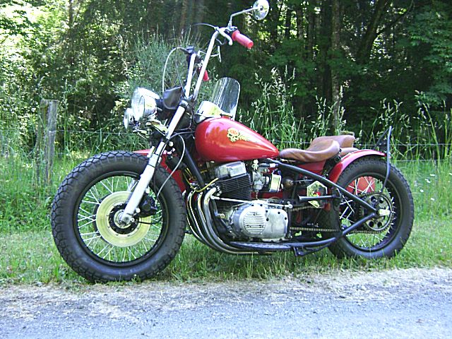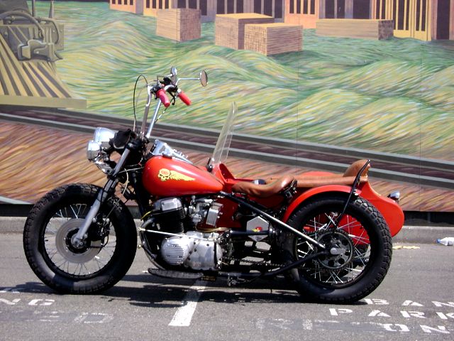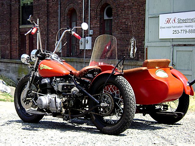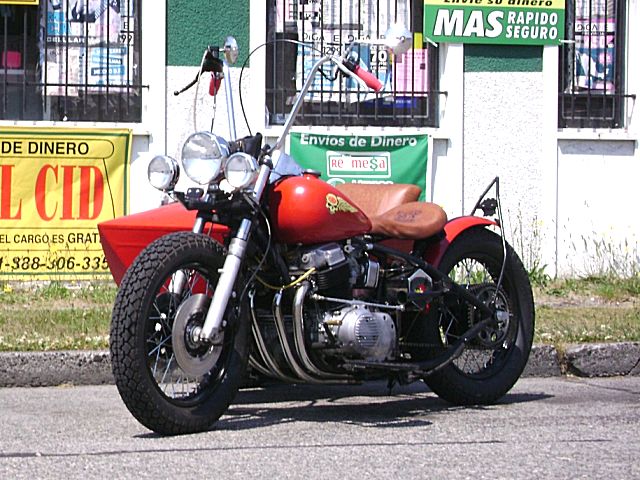 Owner/ Builder: Rick Smith .. I've been working on this bike for 3-4 years with most of the work done the first winter on weekends. It will probably never be done because I'm always changing and modifying things. This bike is a big change from my first bike and Trike. It all started surfing the web and stumbling on this site. I have never taken this bike out without at least one person coming up and checking out my ride. I have done all the work myself except for lacing the wheels (The Wheelmaster Auburn, Washington and the artwork on the electric box (Pin Striping by Skip Redmond, Washington) and powder coating on sidecar rim which isn't holding as good as the painted rims on the bike so we won't give them credit. Thanks to HondaChopper.com and in particular LowRiderTommy who has never steered me wrong. . Front End 1976 Goldwing lowered 2 ½ inches . Frame stock rake, cut out backbone and behind front motor mount stretched 4 inches . Wheels 18 inch rims front and rear with 450 x 18 Cheng Shin tires . Tank Fat Bob tanks . Seat Solo by owner . Rear Fender Model A tire trim ring cut down . Floor Boards By owner . Engine Stock 73 with 77 carbs with breadbox filter in photos, now pods . Headlight Model A re pop . Spotlight FLH . Sidecar 1937 Goulding bought as basket case modified frame to fit . |