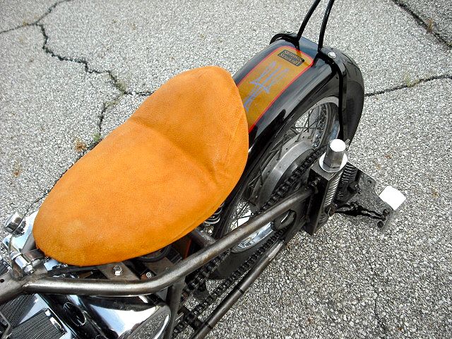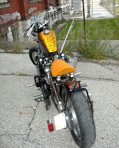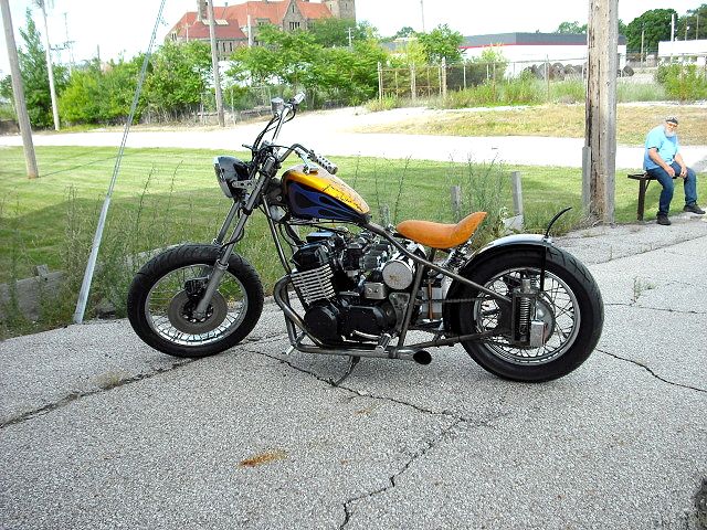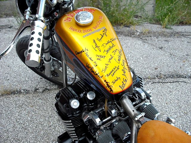 Got a bunch of spare parts laying around the shop so I got the idea to invite any HCMFer who could come over for a one day build. We ran a thread in "Odds and Ends" to prepare and collect missing parts from anyone willing to help. Before long we had a game plan and all the parts. I did spend a bit of time cleaning and preparing parts for the build. LRT painted the gas tank ahead of time so we could have all the guys sign it the day of the build. I added a few names of the guys who sent pieces as well. We did make a whole bunch of parts and assemble the bike in one day with Roadkill as our lead mechanic. It wasn't until 74rat buttoned it up a few days later that we actually got to ride her. Since then I've made several refinements and here she sits in all her glory. Introducing the "One