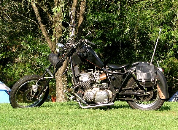 76 modified frame, 4 inches in the down tubes, 1 inch in the back bone, seat rails lowered, custom oil tank (Streetracer), custom coil box and elec box (Bac750), grasshopper springer J.H., custom front brake (LRT) and company, headlight TLC spot, 74 engine with 836 kit, 11:1 forged pistons, Barnett racing cam, heavy valve springs, and 2 into 1 cut down shotgun style pipes. |